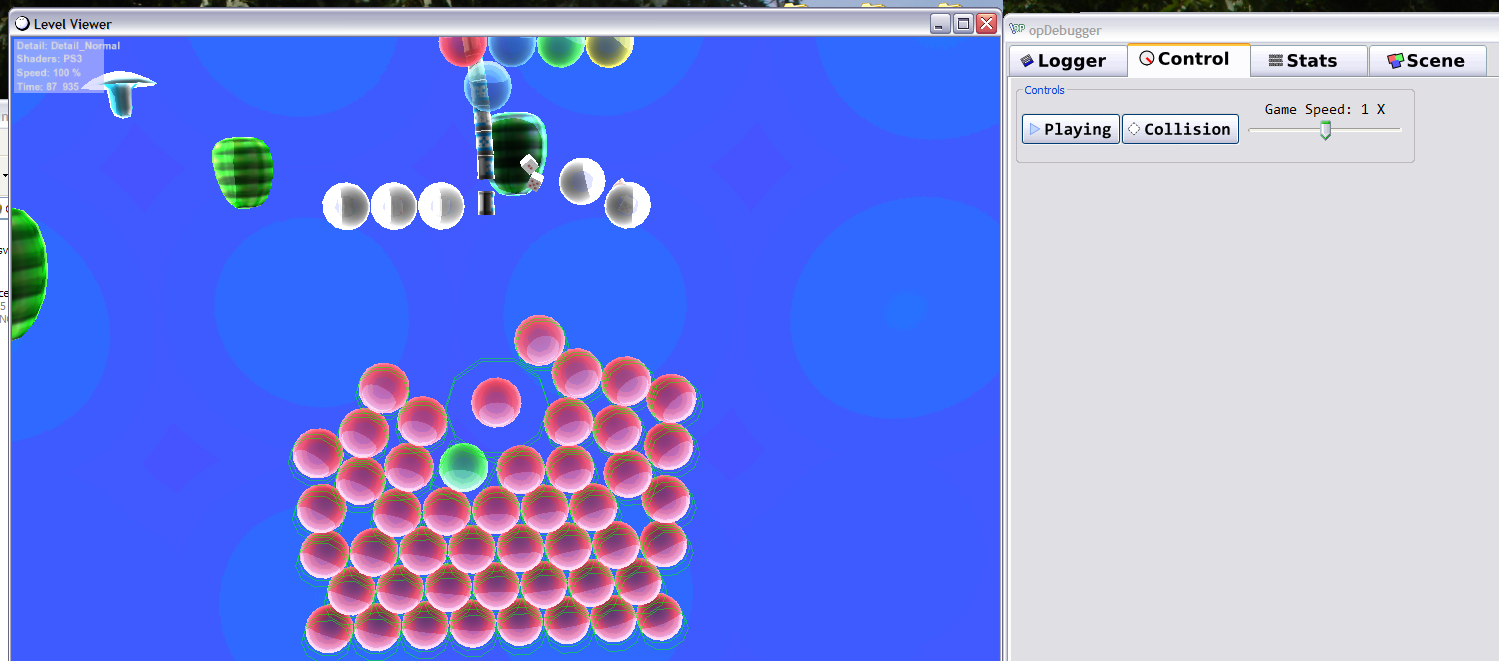 This image shows our integration with Box2d physics, showing the collision shapes outlining each actor.