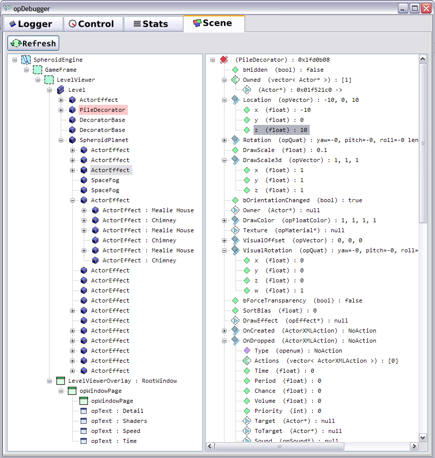 This image shows the opC++ Standard Dialect in action - opC++ reflection is used by the opDebugger to see all engine data at runtime.