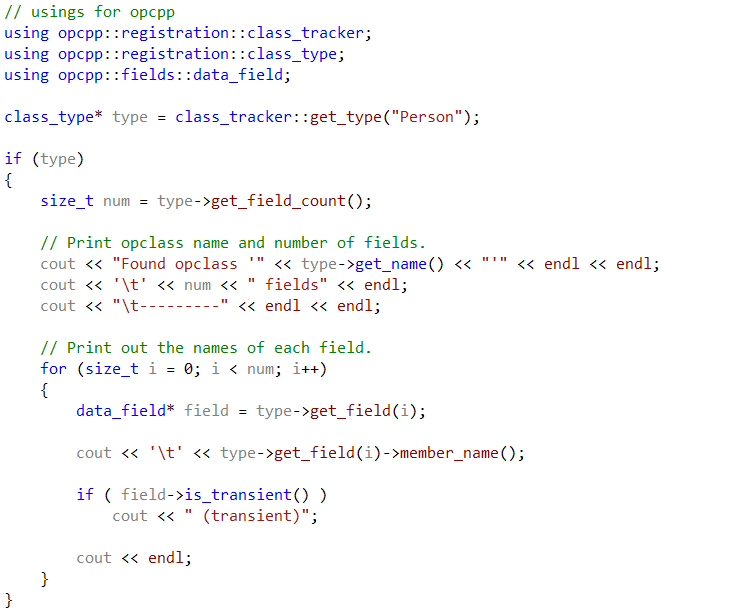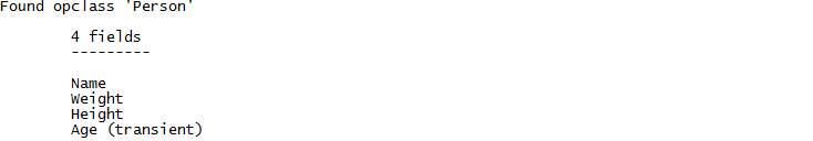 In the example above we loop through the opclass' fields and print their names to the standard out. If a data member is transient, we print out that information also.