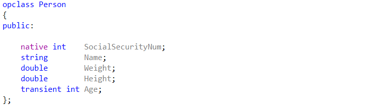 In this simple opclass, called Person, we define several public data members. Two of the data members have modifiers introduced in the opC++ Standard Dialect: native and transient. The native modifier specifies that the data member it accompanies is not reflectable (and not serializable). The transient modifier means that the reflected data member is marked as not serializable by meta-data.